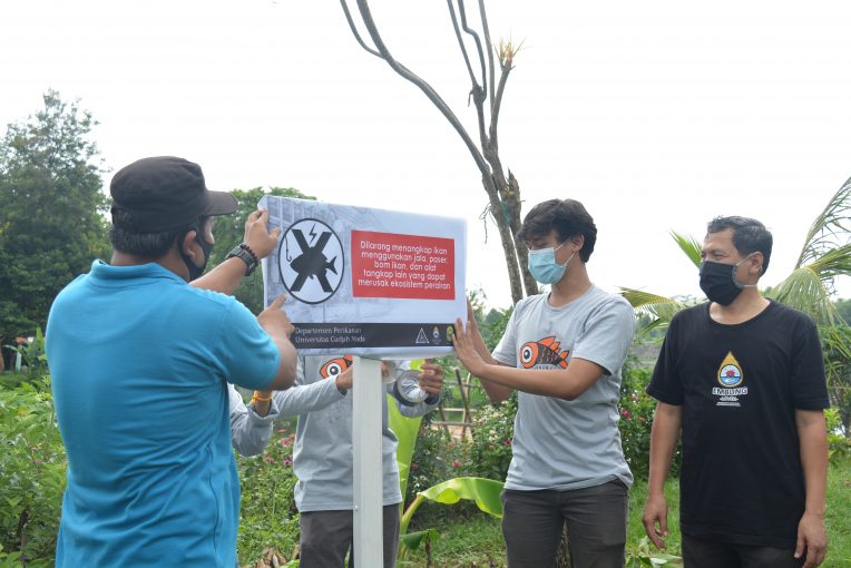 Pemasangan plang informasi yang berisi tentang himbauan-himbauan akan pentingnya menjaga lingkungan juga dilakukan di 6 titik yang diletakkan secara merata. Kegiatan ini dilanjutkan dengan edukasi Perikanan melalui media ajar gambar dan menyusun puzzle juga dilaksanakan dan diikuti oleh sekitar 20 anak berusia 5-10 tahun dengan menerapkan protokol kesehatan.
